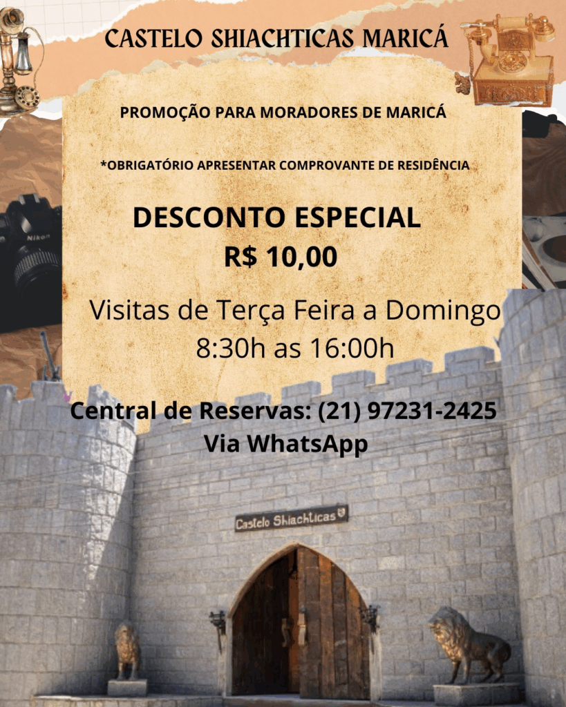 O Castelo Shiachticas Maricá oferece uma promoção de ingresso promocional a R$ 10,00 para moradores de Maricá. Para ter direito ao desconto de morador em Maricá, é preciso apresentar um comprovante de residência e um documento de identificação oficial com foto, que pode ser um comprovante de conta de água, luz, gás ou telefone, ou similar.